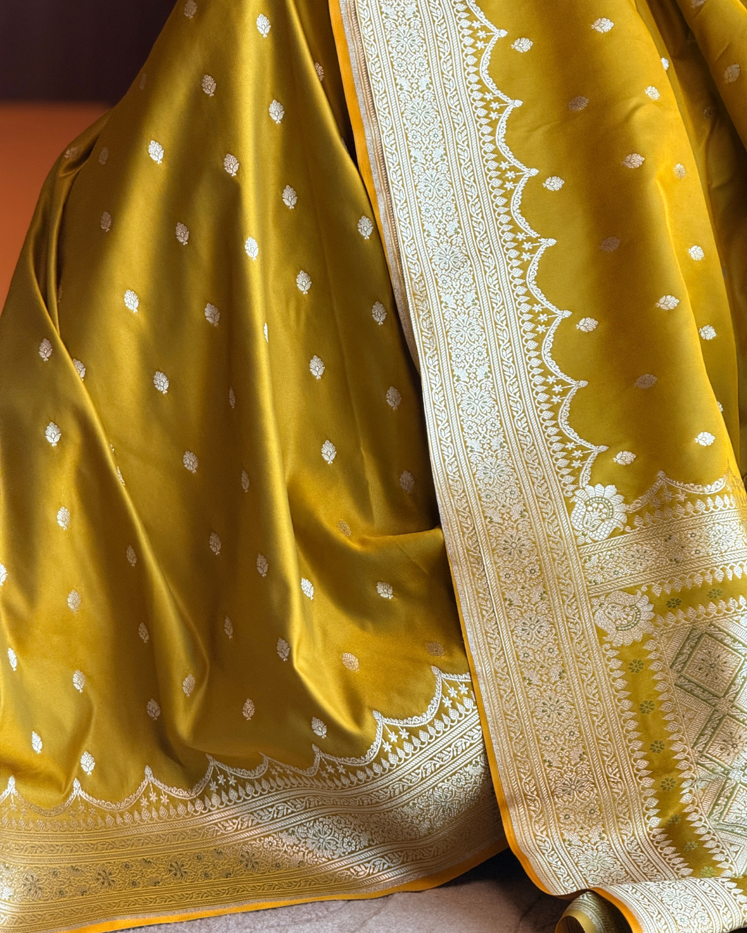 Drape yourself in the luminous charm of a mustard-yellow semi-satin Banarasi saree, delicately woven with subtle silver zari and accented with vibrant green meenakari touches. The shimmering silver threads catch the light beautifully, while the green meenakari lends a refreshing pop of color, giving the piece an elegant yet playful edge. Lightweight and graceful, this saree strikes the perfect balance between party-ready glam and comfortable wear—ideal for festive evenings, cocktail gatherings or stylish soirees without the heavy weight of traditional bridal silk.
